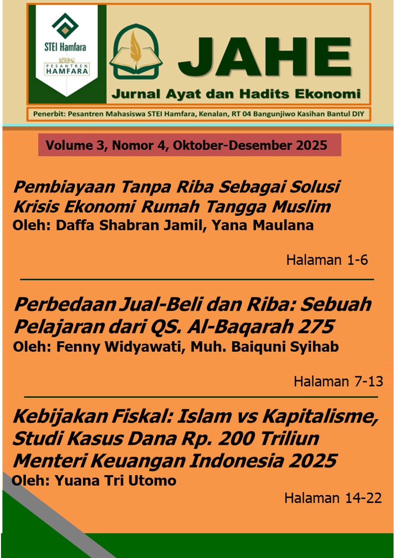 Alhamdulillaah, JAHE edisi tahun ke-3 nomer 4 Oktober-Desember 2025 ini terbit atas ijin Allah SWT semata. Hidangan JAHE dimasak di kelas-kelas ekonomi Islam dengan kajian tsaqofah Islamiyah sebagai menu utamanya, meskipun diformat dengan kerangka ilmiah sistematika IMRAD. JAHE edisi ini menyajikan tema utama tentang riba dalam beberapa artikelnya. Selamat menikmati.